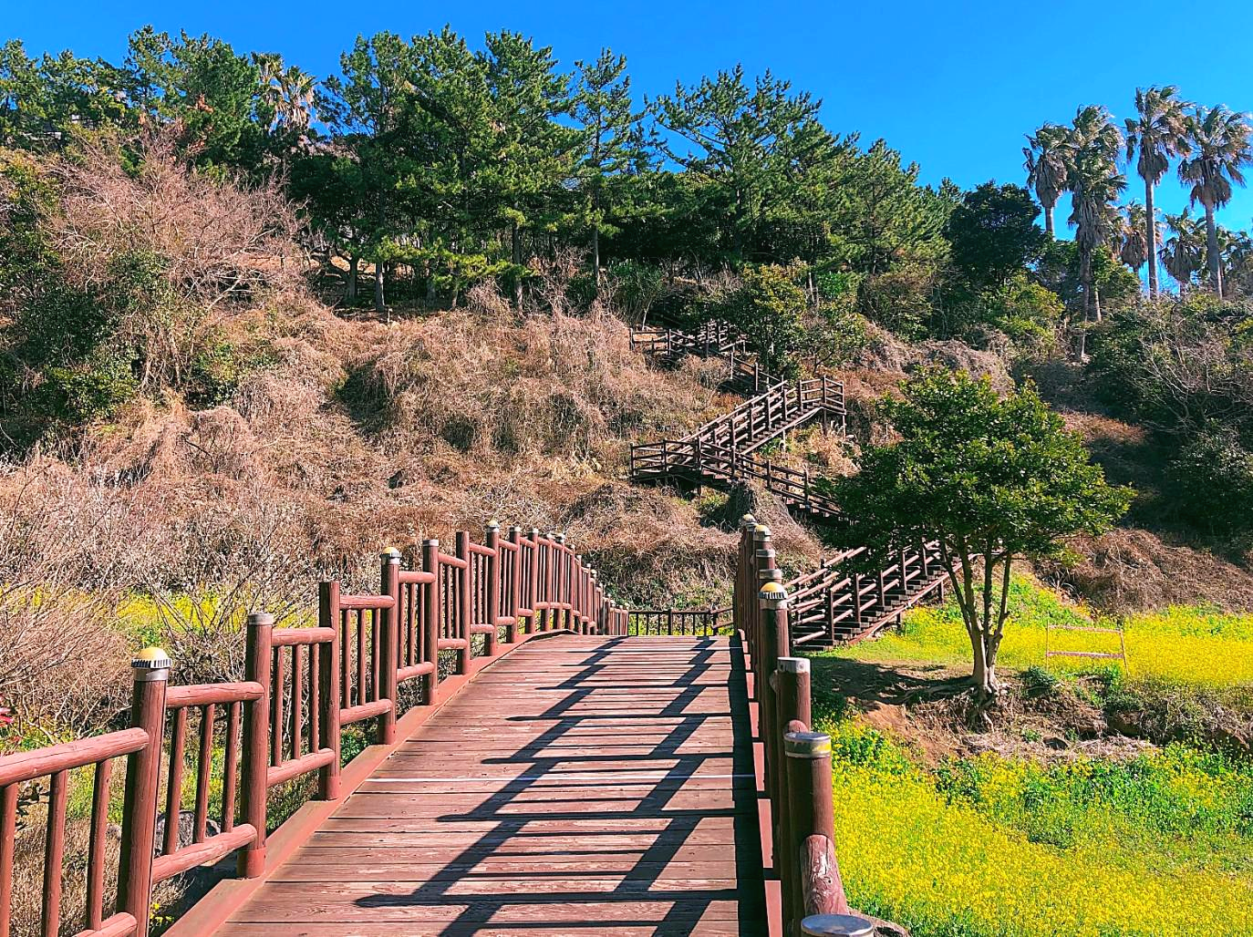 산방산보다 최근 떠오르는 엉덩물계곡이라는 곳입니다. 제주도 유채꽃 핫플레이스로 떠오르는 곳입니다. 모든 길이 나무데크가 깔려있어서 산책하기 좋다고 합니다. 이국적인 분위기를 느낄 수 있는 곳입니다. 보통 제주도에 유채꽃을 무료로 즐길 수 있는 곳입니다. 중문 관광단지 호텔과 연결되어있어 호텔 투숙이나 관광객들의 인기 만점인 곳입니다. 엉덩물 계곡에서는 유채꽃뿐만 아니라 매화도 함께 볼 수 있습니다. 넓은 계곡을 따라 유채꽃이 장관을 이루는 곳입니다.