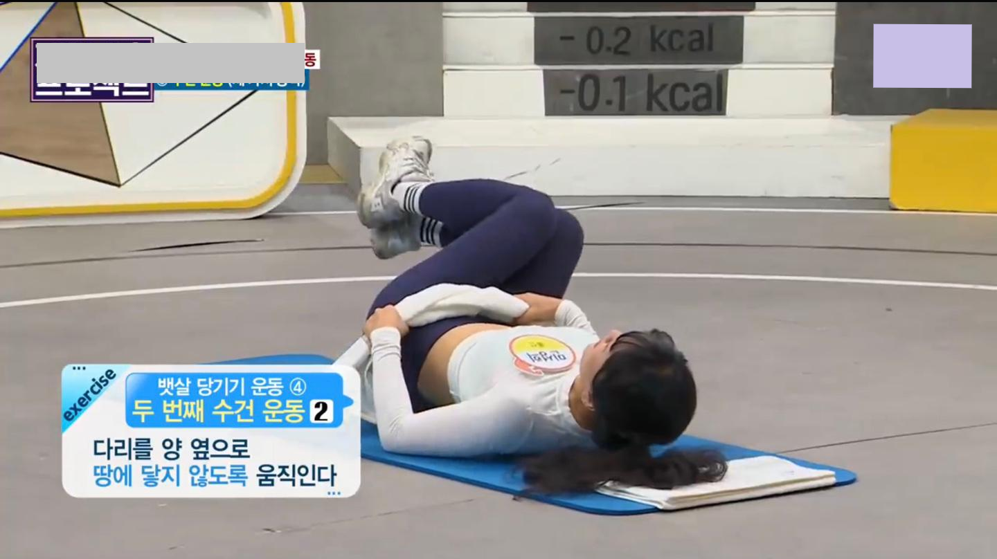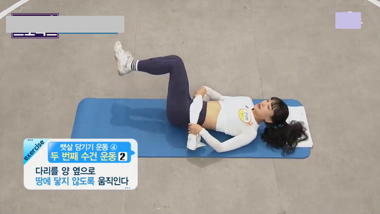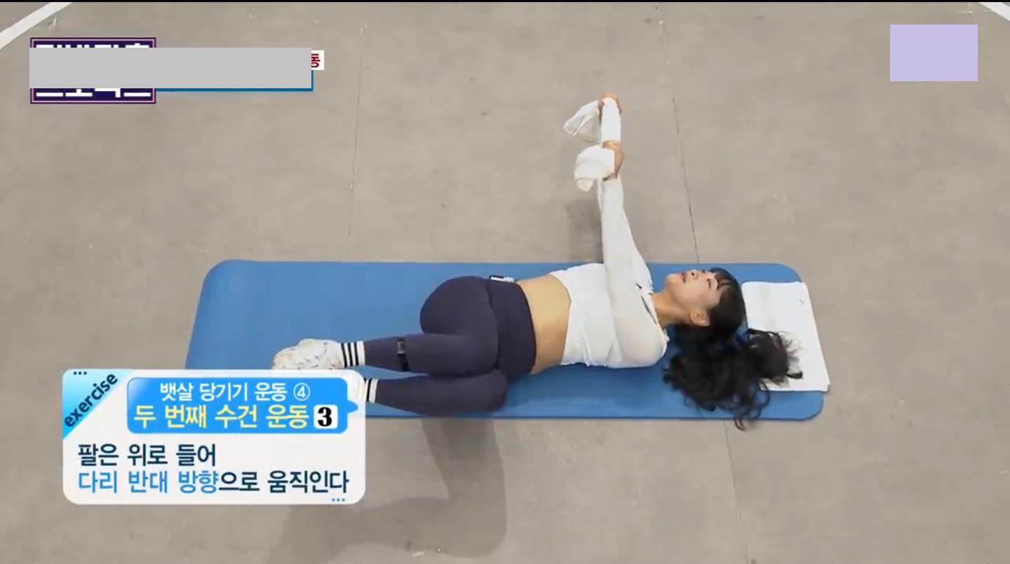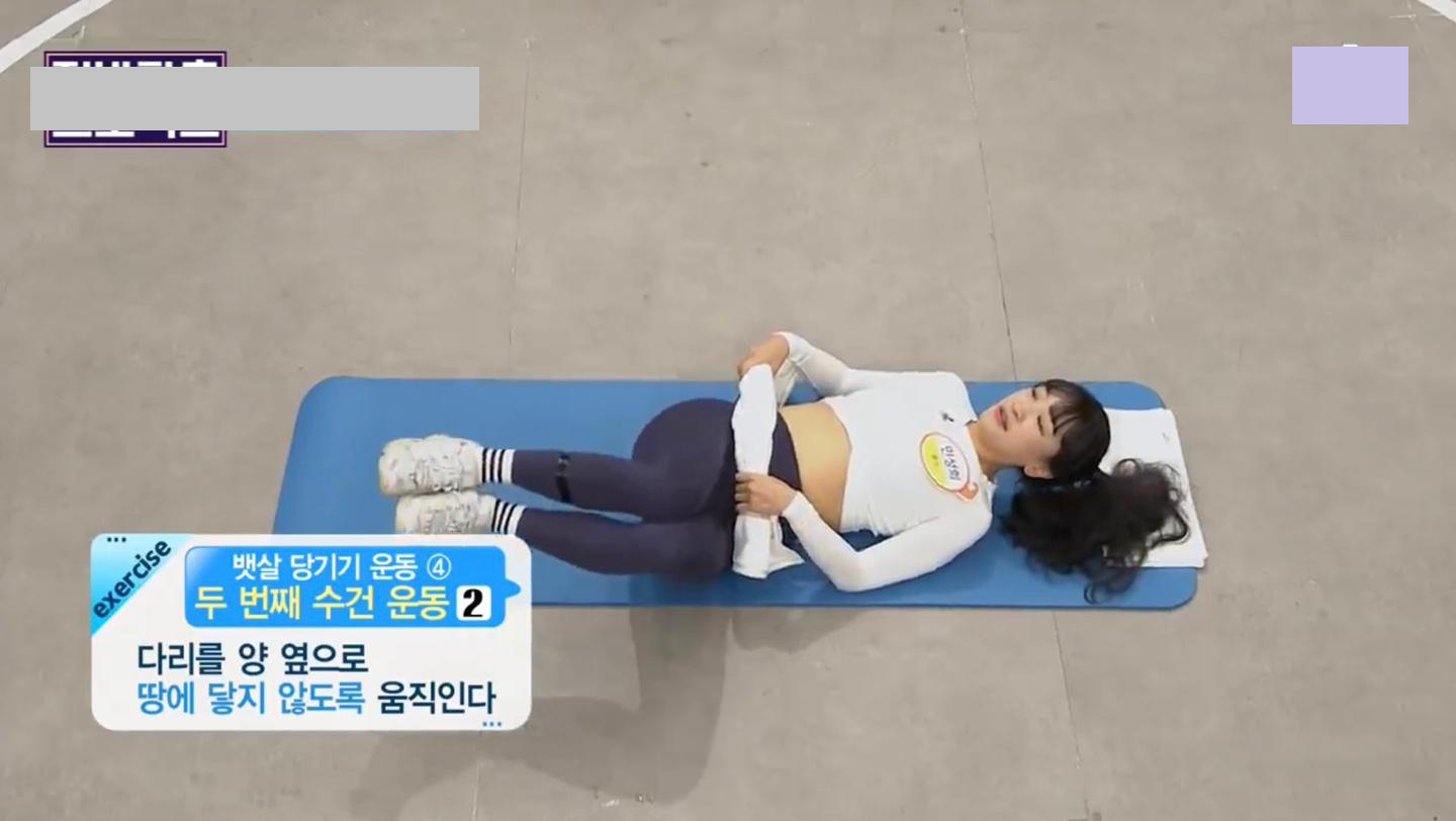 다리를 양 옆으로 땅에 닿지 않게 움직인다. 이때 수건을 손에 잡은 상체는 다리와 반대 방향으로 움직여서 옆구리 배 쪽에 자극을 준다.