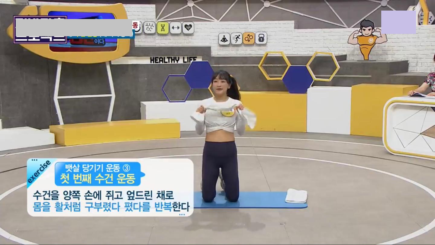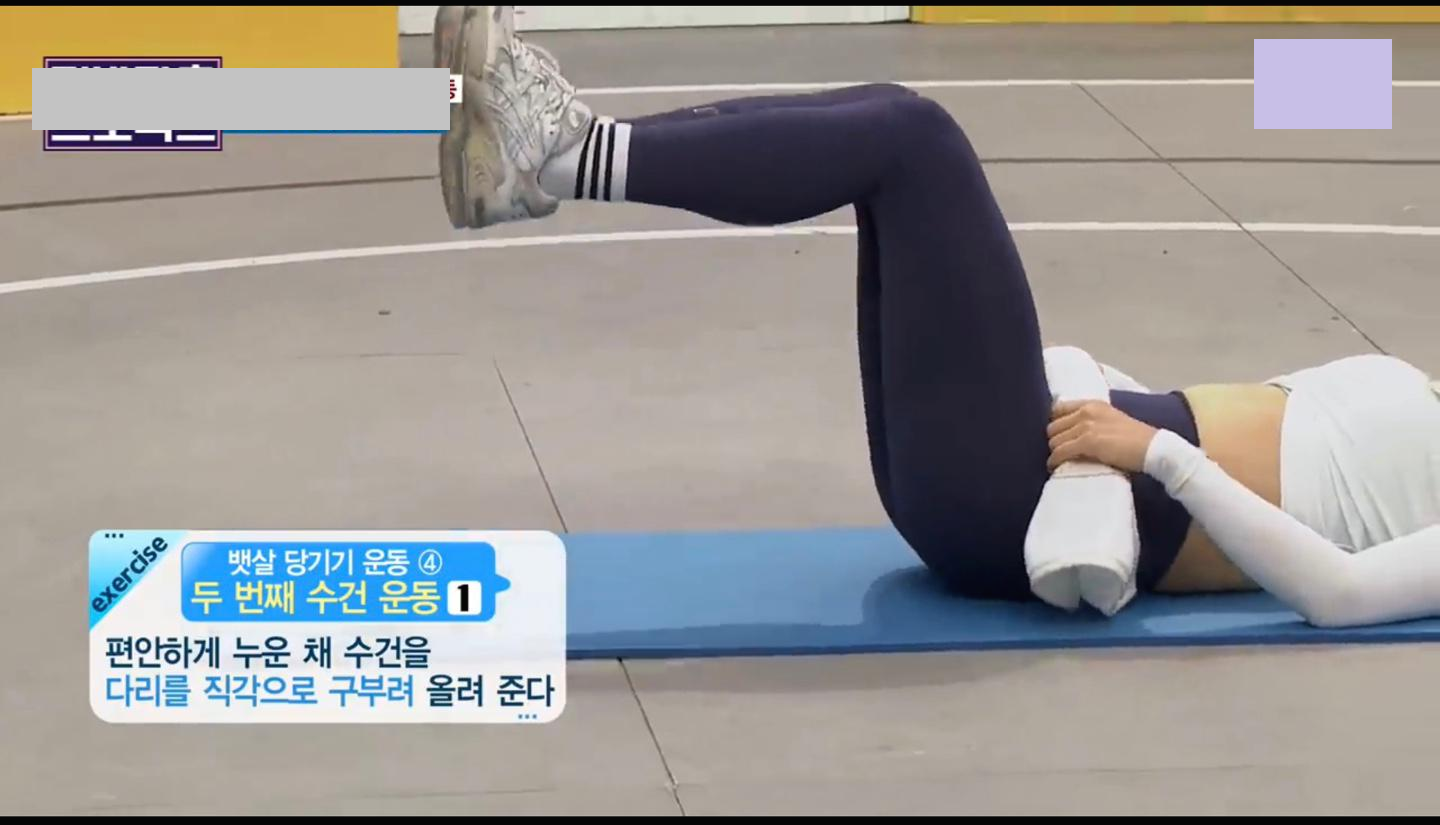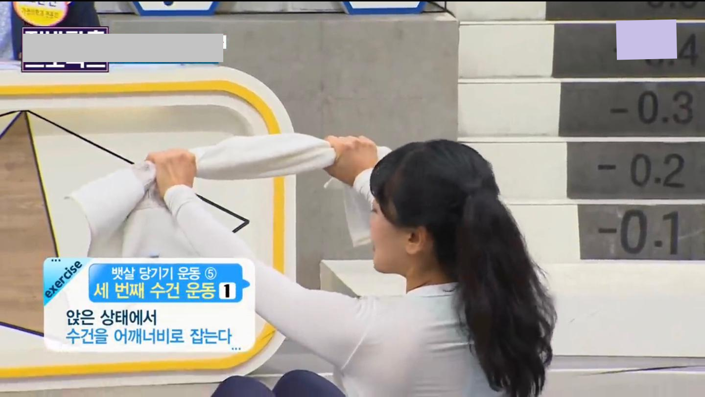 첫 번째 수건 운동은 목, 허리, 엉덩이, 허벅지, 종아리, 몸 뒤쪽과 복부가 자극되는 운동이다.