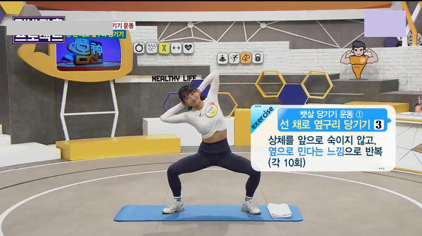 선채로 옆구리 당기기 운동은 허벅지 안쪽의 힘으로 버티면서 복부 측면이 자극되는 운동이다.