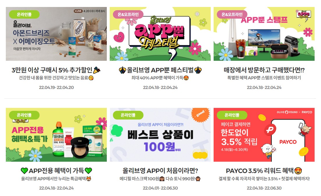 따뜻한 봄이 시작되는 4월 올리브영에서도 획기적인 이벤트를 하고 있습니다. 올리브영은 딱히 한, 두 개의 할인과 이벤트를 하는 것이 아니라 다양한 제품군과 카테고리별로 진행하고 있기 때문에 꼼꼼하게 확인하시고 이번 달 혜택을 받으시길 추천드립니다.