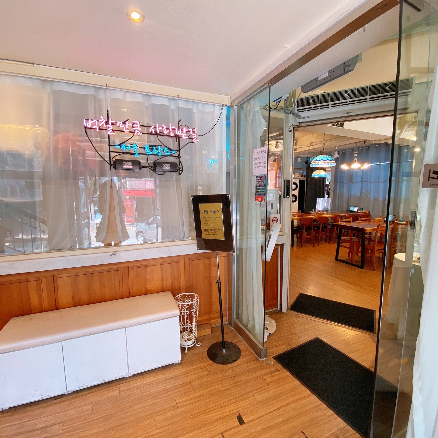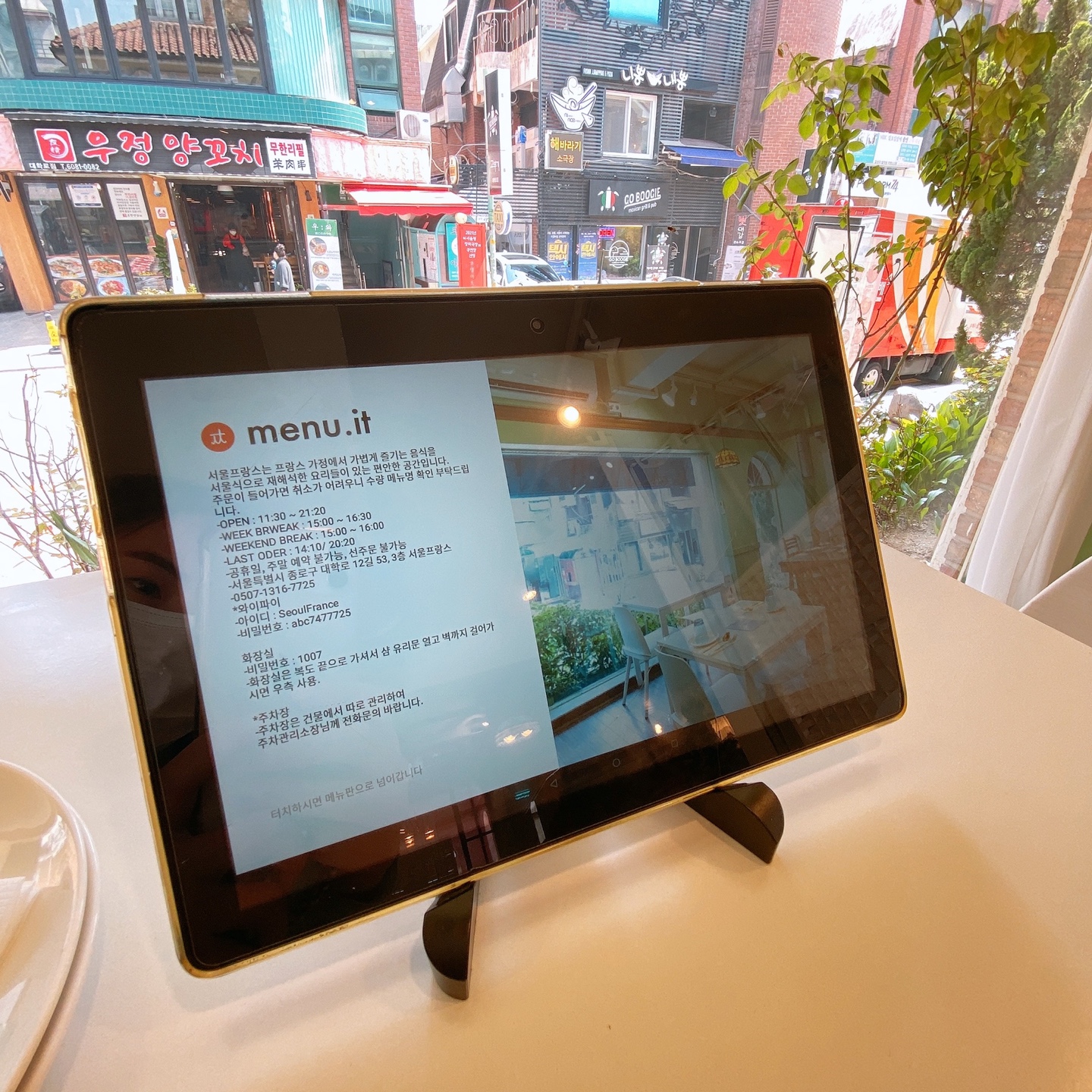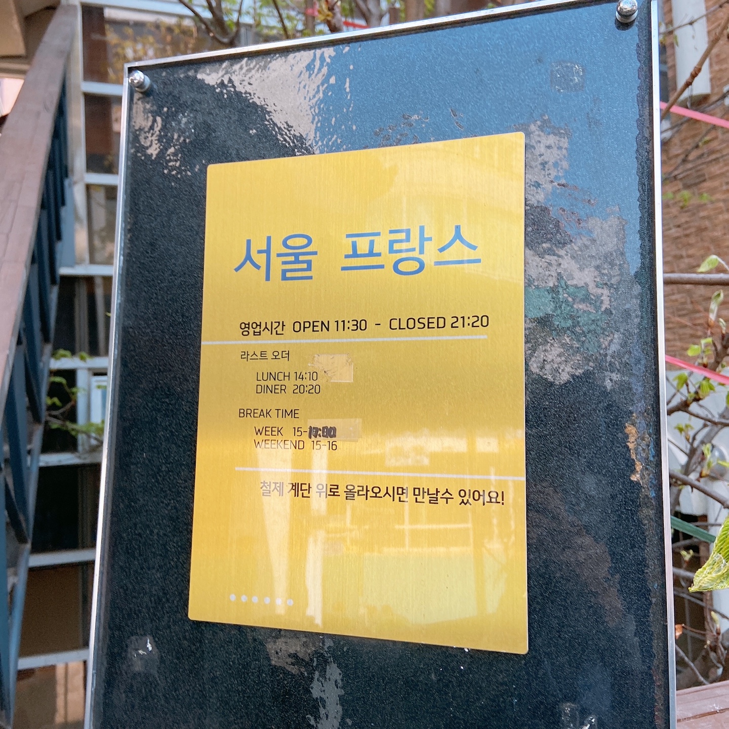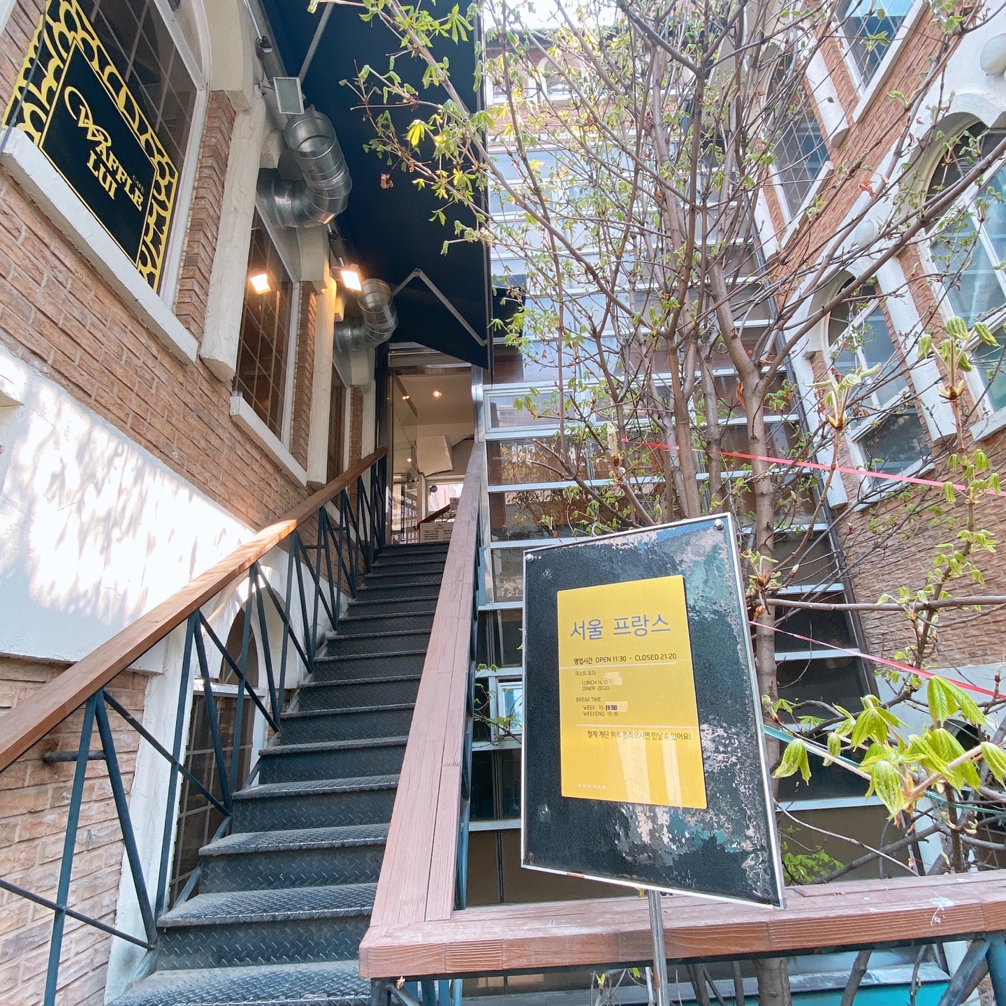 건물과 함께 인테리어로 되어있는 나무와 어우러진 철제 계단이 벌써 식당의 분위기를 색다르게 보이도록 한다. 정말 간판이고 안내문이고 서울 프랑스라는 간단한 디자인이 더 특별해 보인다.