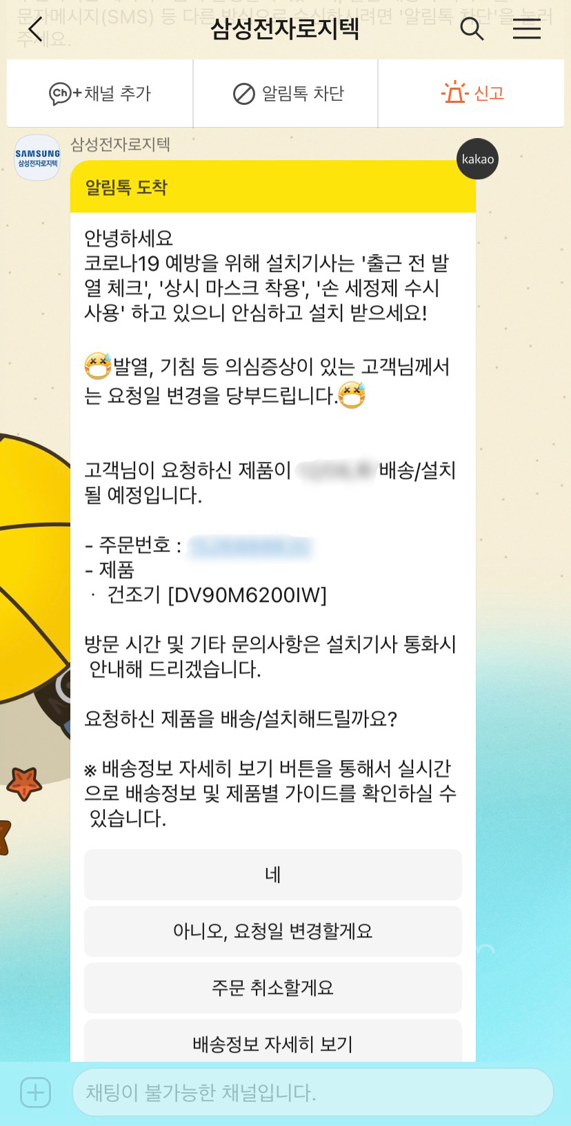 배송전날에 카톡으로 톡이 옵니다~ 그러면 배송/설치 날짜를 바꿀수도 있고 제품을 취소할 수도 있습니다.