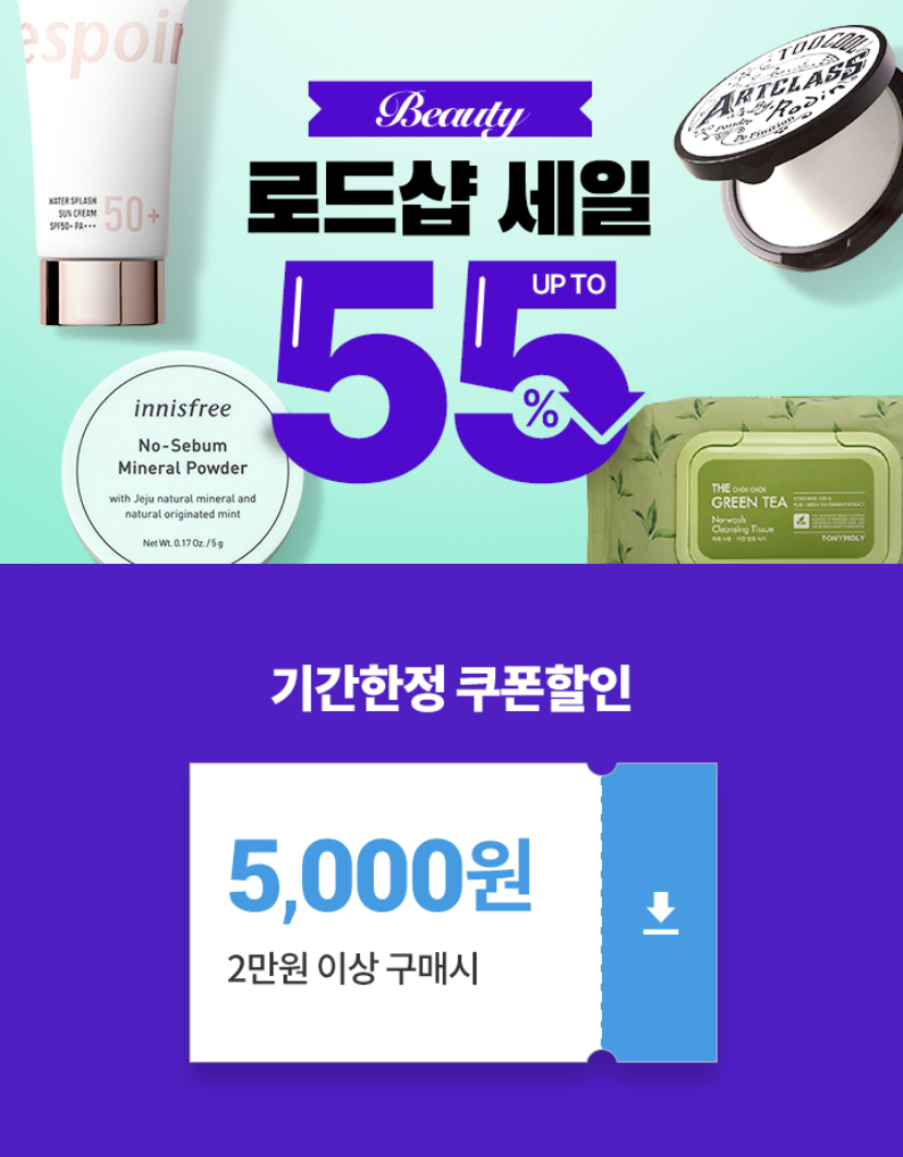 지금 쿠팡에서는 로드샵 세일로 최대 55%의 할인된 금액으로 화장품을 구매할 수 있고 기간한정쿠폰으로 2만원 이상 구매시 5천원 할인 쿠폰을 제공하고 있습니다.