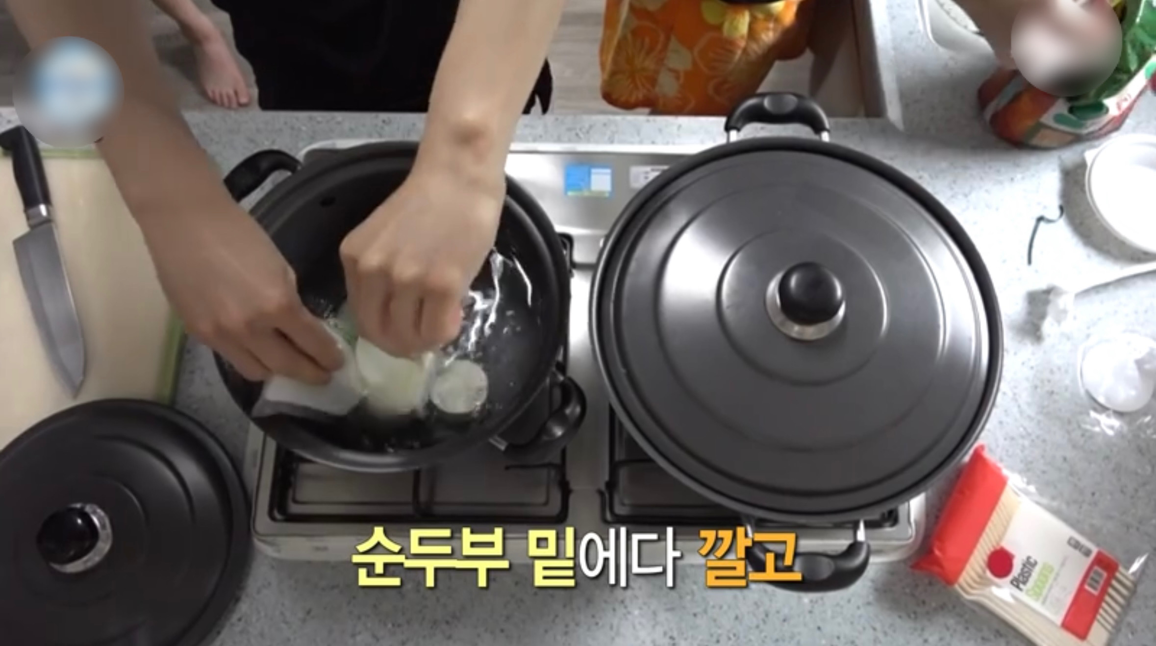 물이 서서히 끓어오르기 시작하면 순두부를 밑에 먼저 깔아줍니다.