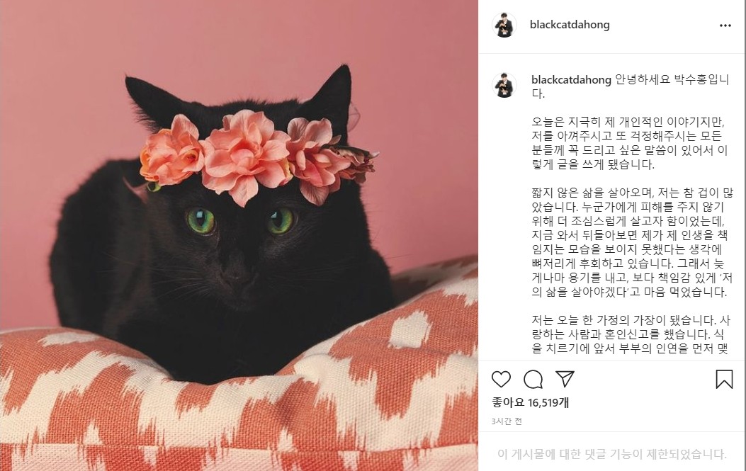 박수홍은 28일(오늘) 반려묘 다홍이 인스타그램을 통해 결혼 소식을 전했습니다.