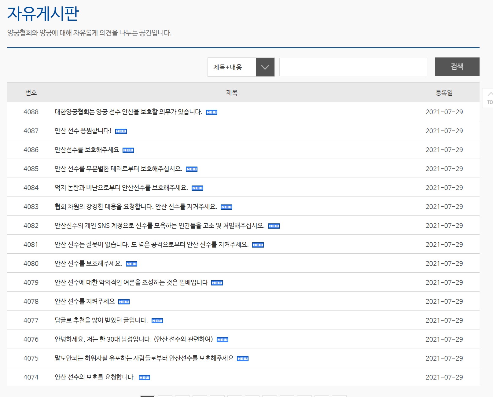 대한양궁협회 홈페이지 자유게시판에 불과 짧은 시간에 300개가 넘는 게시글이 올라왔습다.
