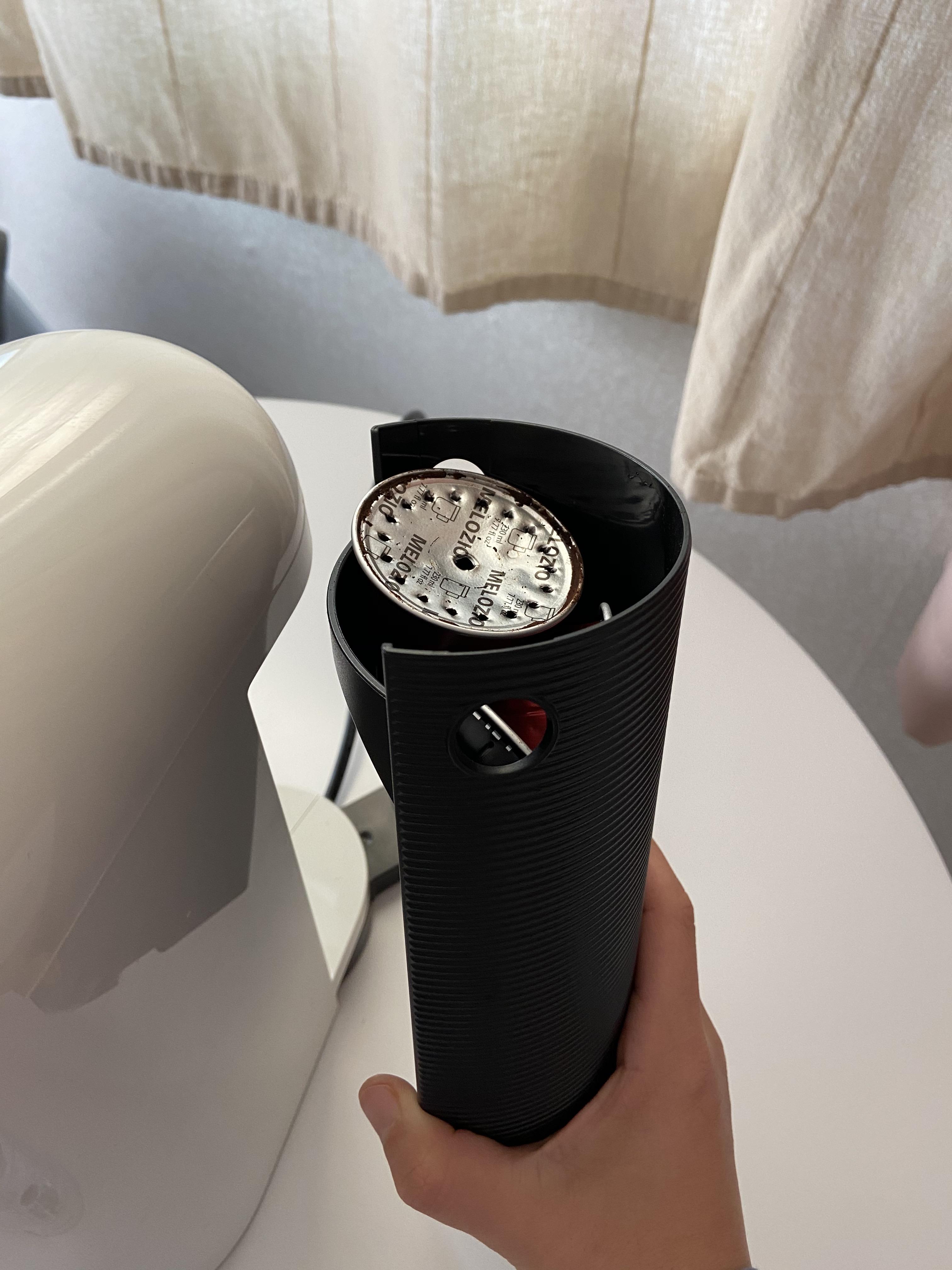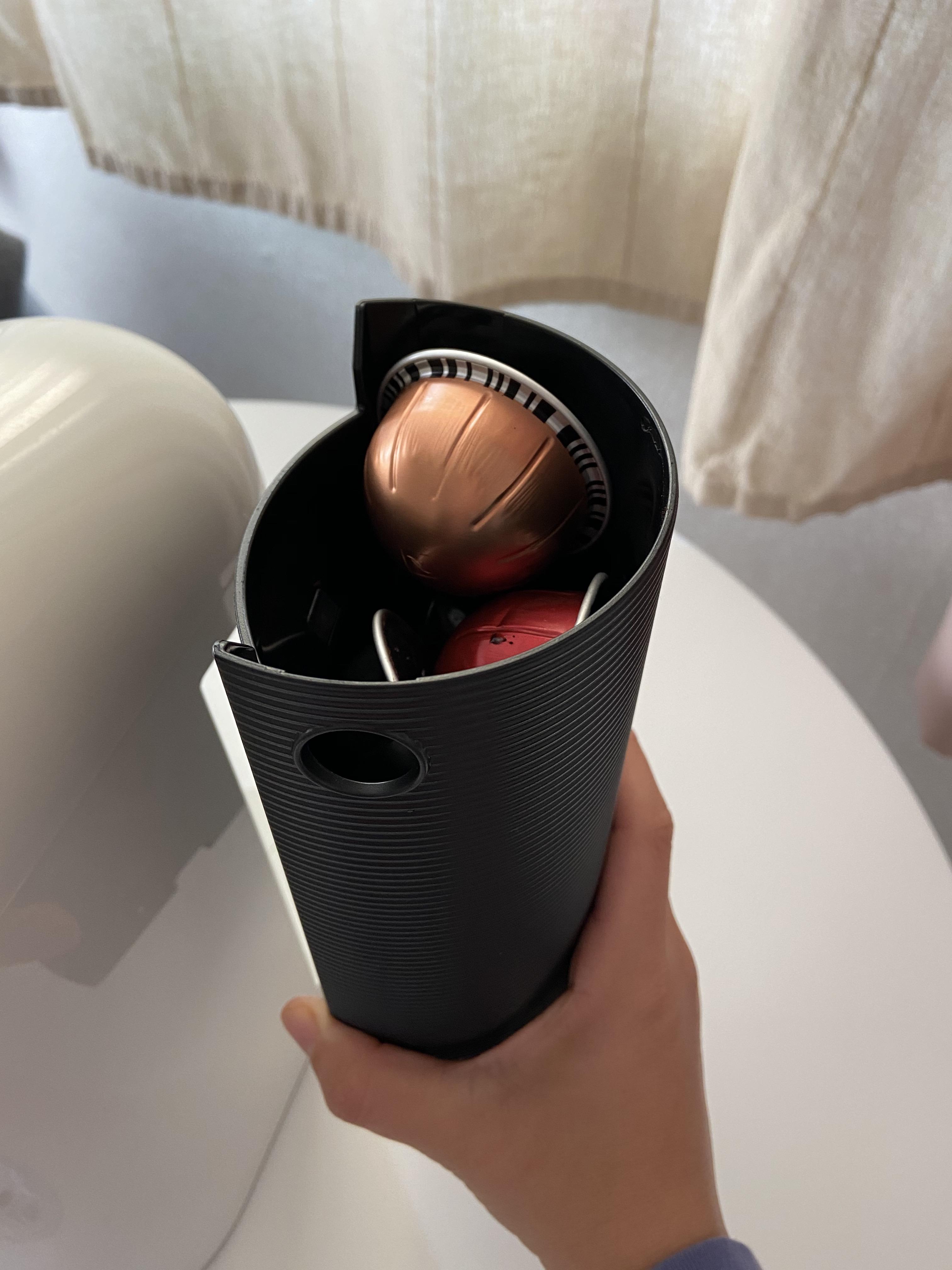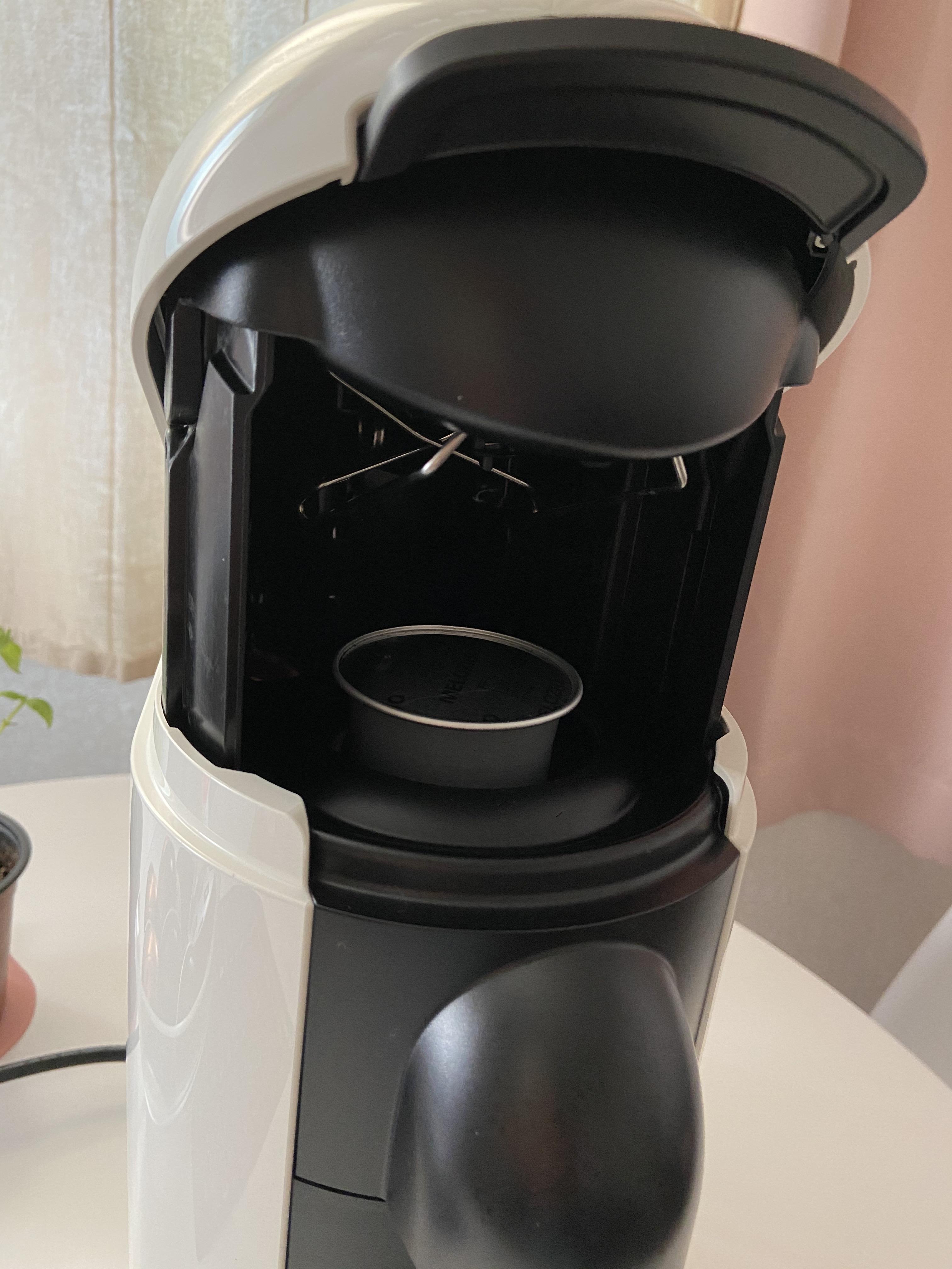 - 네스프레소 버츄오 전용 캡슐을 넣어줍니다. 다시 아래로 내려주면 뚜껑이 닫혀요.