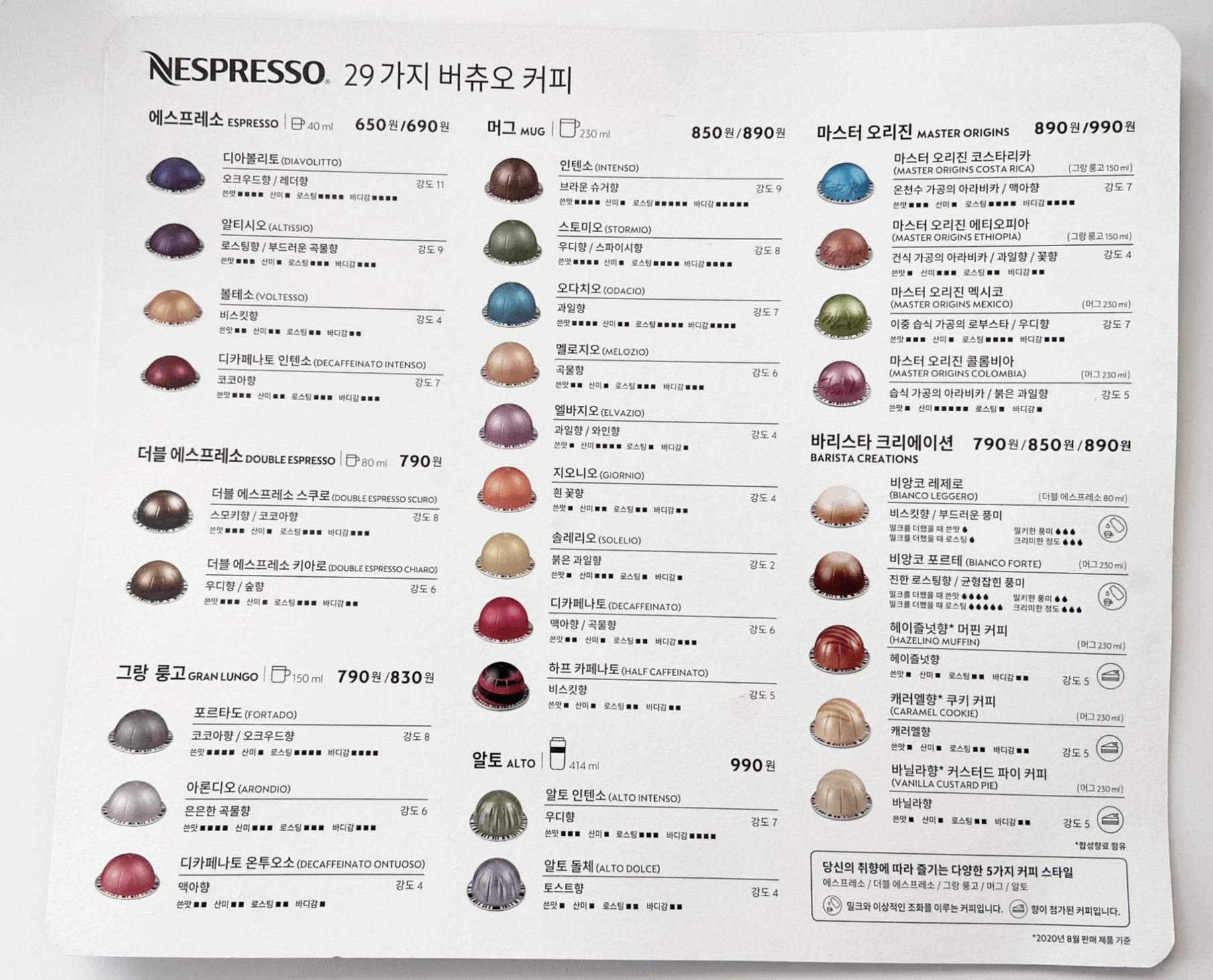 매장에 가시면 네스프레소 버츄오 캡슐 종류와 향, 바디감, 로스팅 등 안내해주는 리플렛을 받으실 수 있습니다.