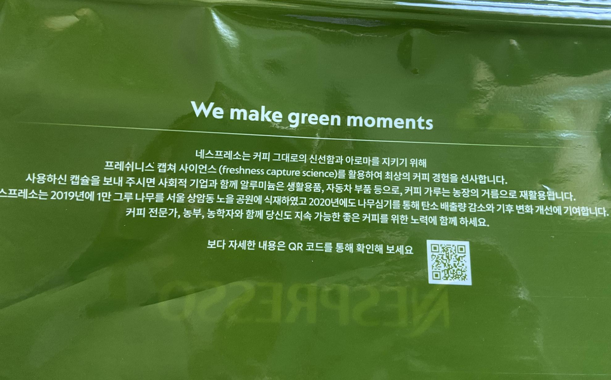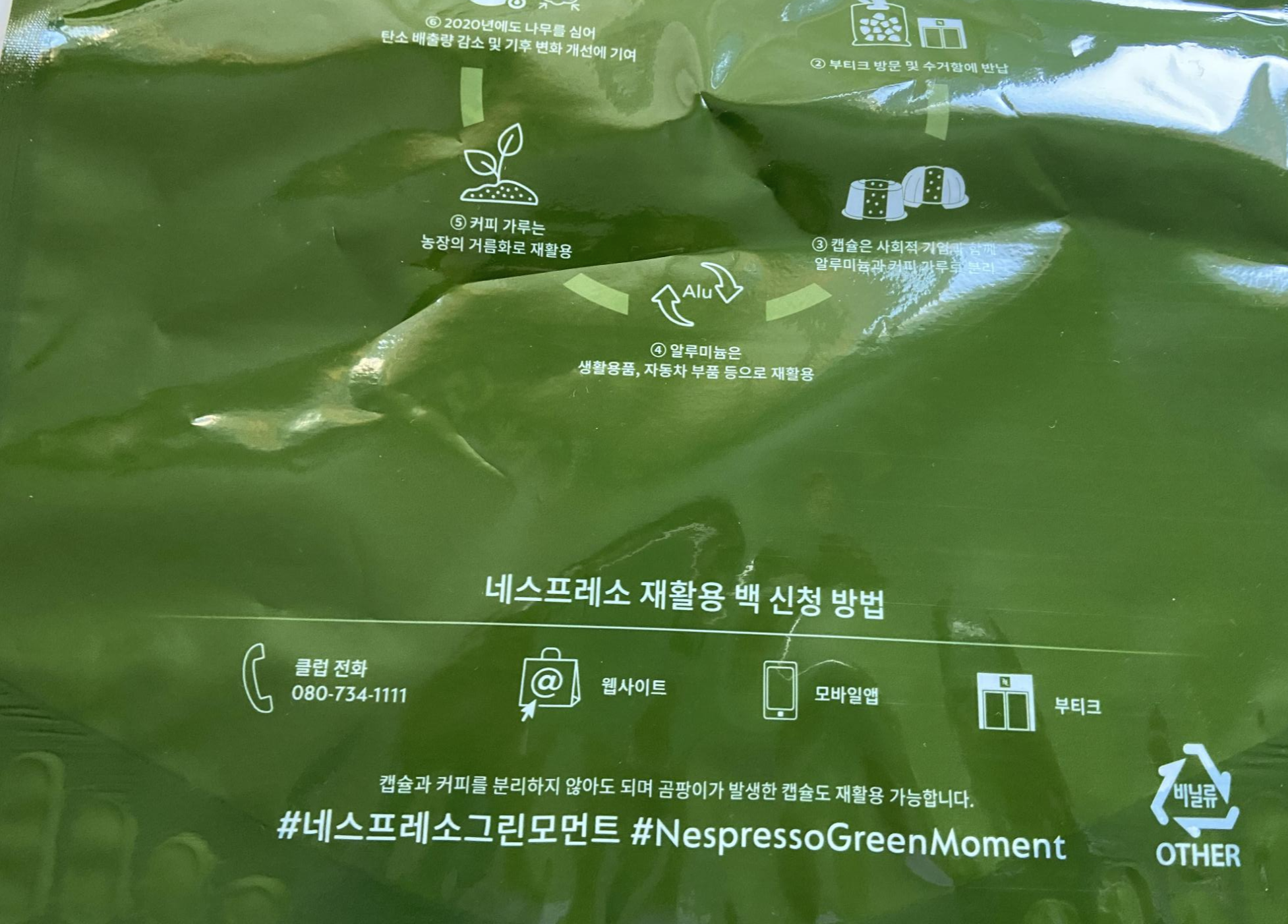 다 쓴 캡슐이 자체적으로 재활용이 가능합니다. 그냥 일반쓰레기에 버리셔도 되고 네스프레소재활용 백을 신청해서 보내셔도 됩니다~ 환경을 생각해서는 재활용 택배도 추천드려요~