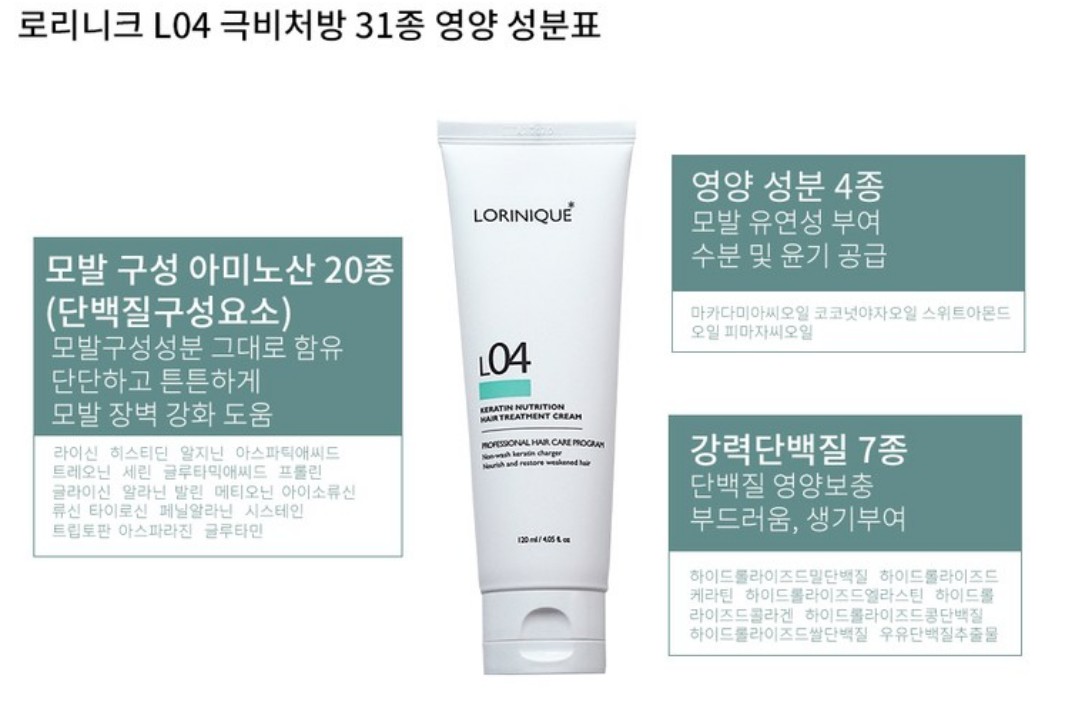 손상된 헤어 머릿결을 복구시키기 위한 정확한 크리닉은 바로 '단백질' 공급입니다. 로리니크 헤어 에센스 크림은 모발에 꼭 필요한 단백질을 종류별로 31개 영양성분으로 보강해줘 건강하고 부드러운 모발을 만들어 준다네요.
