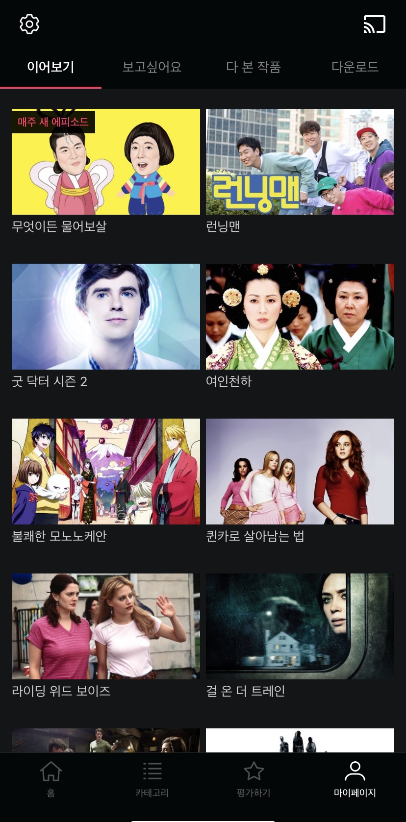마이페이지가 활성화되면 그동안 내가 시청했던 동영상의 목록이 나옵니다.