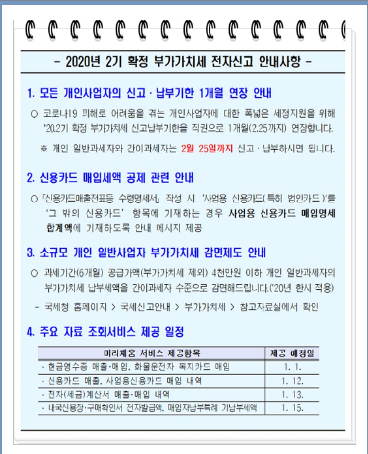 코로나로 피해를 겪는 개인사업자에 대한 세정지원을 위해 '20.2기 확정 부가가치세 신고납부기한을 1개월 연장합니다.