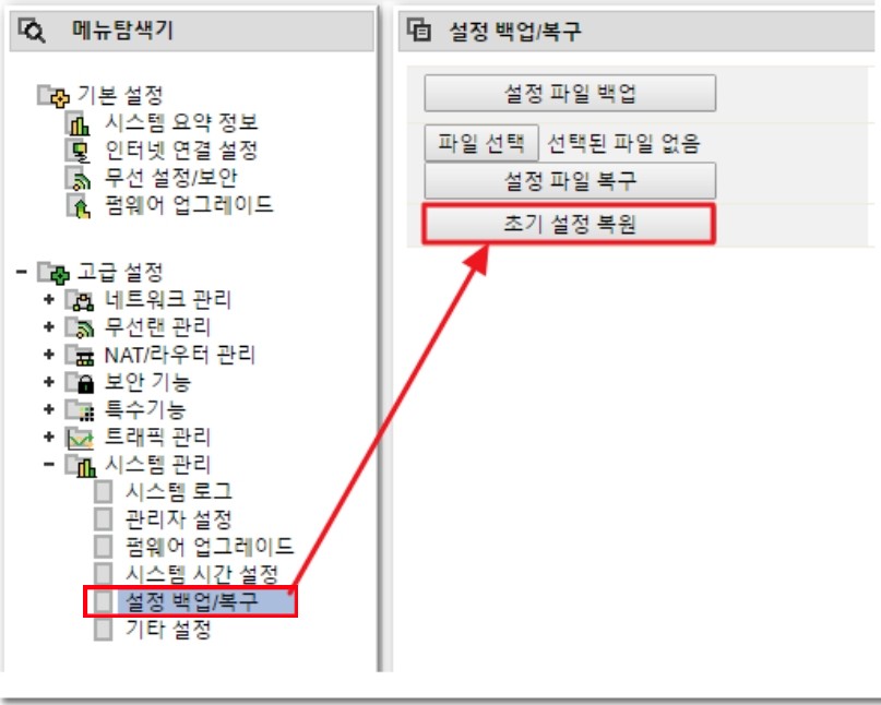 시스템 관리 - 설정 백업/복구 - 초기 설정 복원을 누르시면 iptime아이피타임 무선 공유기를 초기화됩니다.