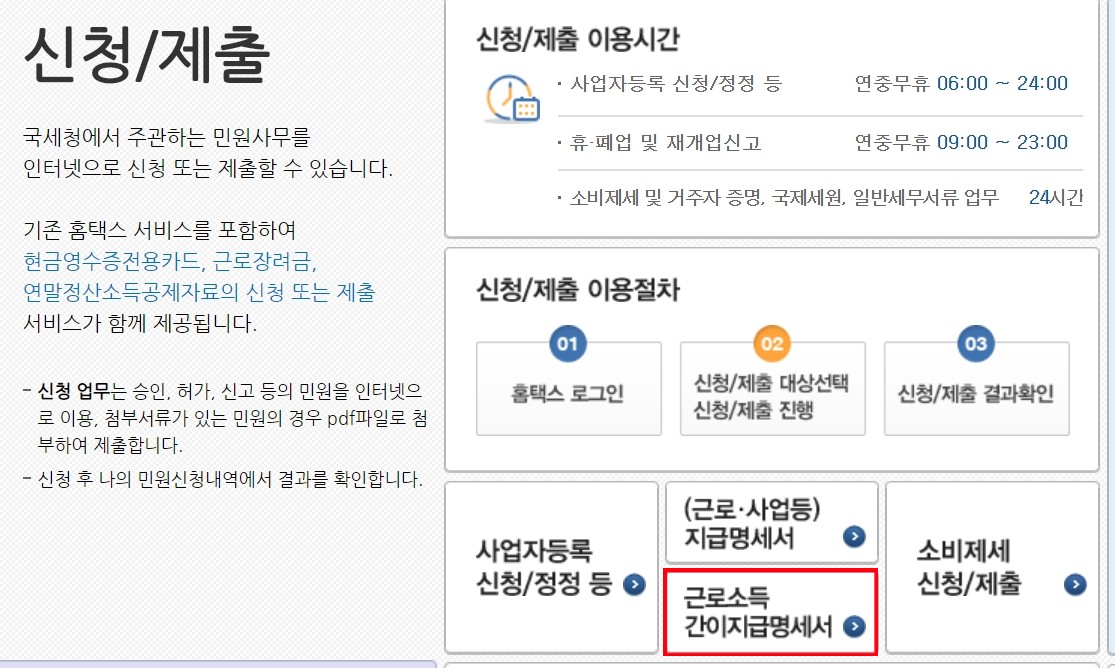 1. 홈택스(www.hometax.go.kr) [로그인] -[신청/제출]을 선택합니다.