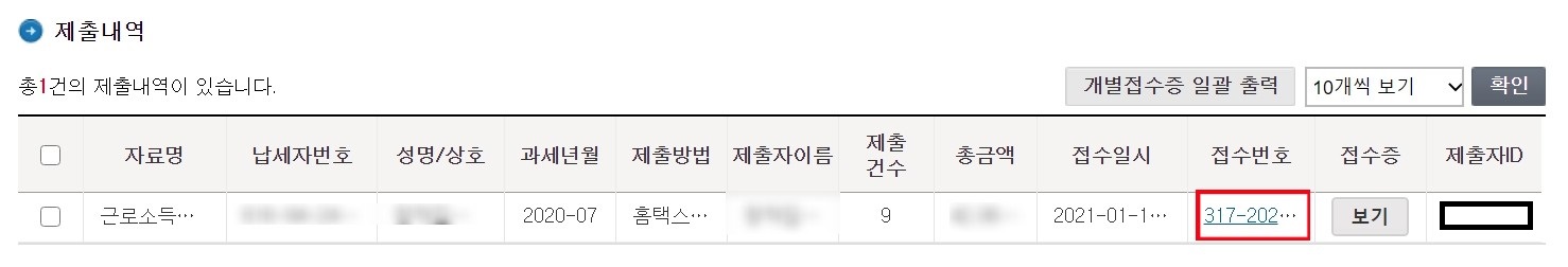 아까 제가 작성한 내역이 잘 접수되었다고 나옵니다. 접수번호를 클릭하시면 [근로소득 간이 지급명세서]를 파일로 저장할 수 있습니다.