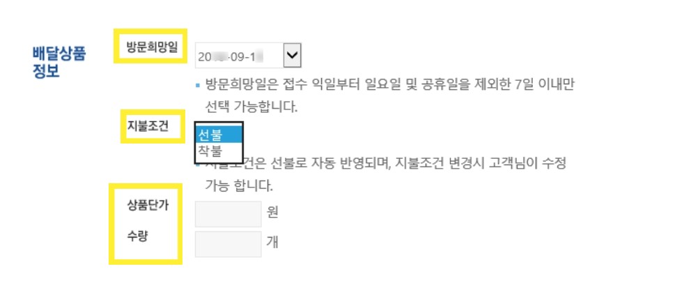 택배비를 선불, 착불 할지 선택하고 상품단가와 수량을 선택합니다.