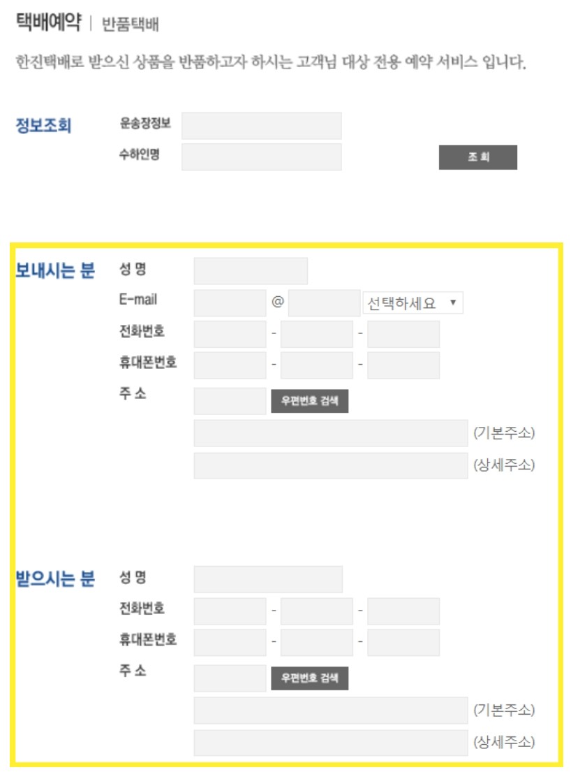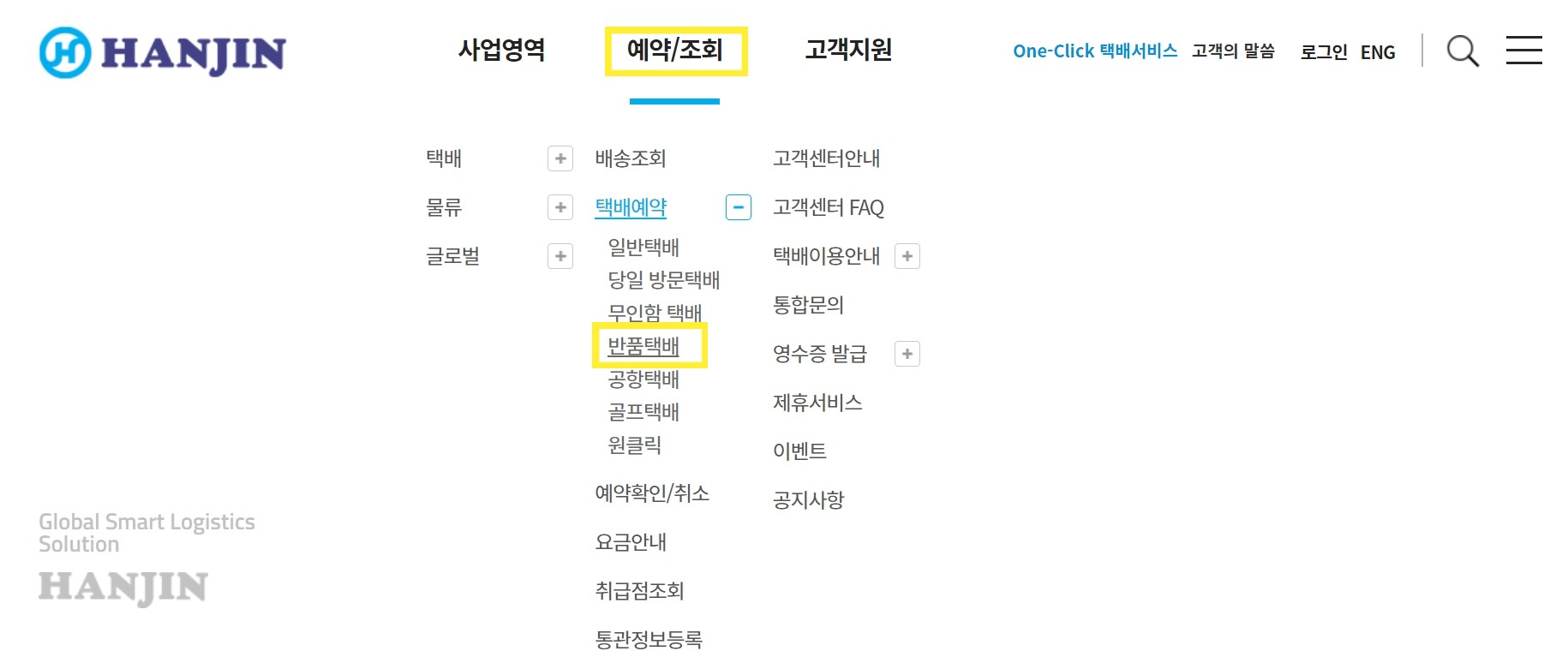 ◈ 한진택배 홈페이지 > 예약/조회> 택배 예약> 반품 택배