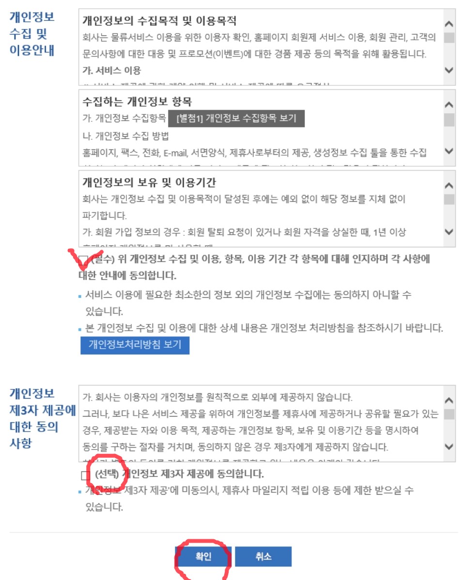으레 진행되는 개인정보 동의서~ 저는 웬만하면 '필수'만 체크하고 '선택'부분은 대부분 광고성이 많아서 잘 선택하지 않습니다. 원하시는 분은 체크하시고 ~확인하시고 접수하시면 됩니다.