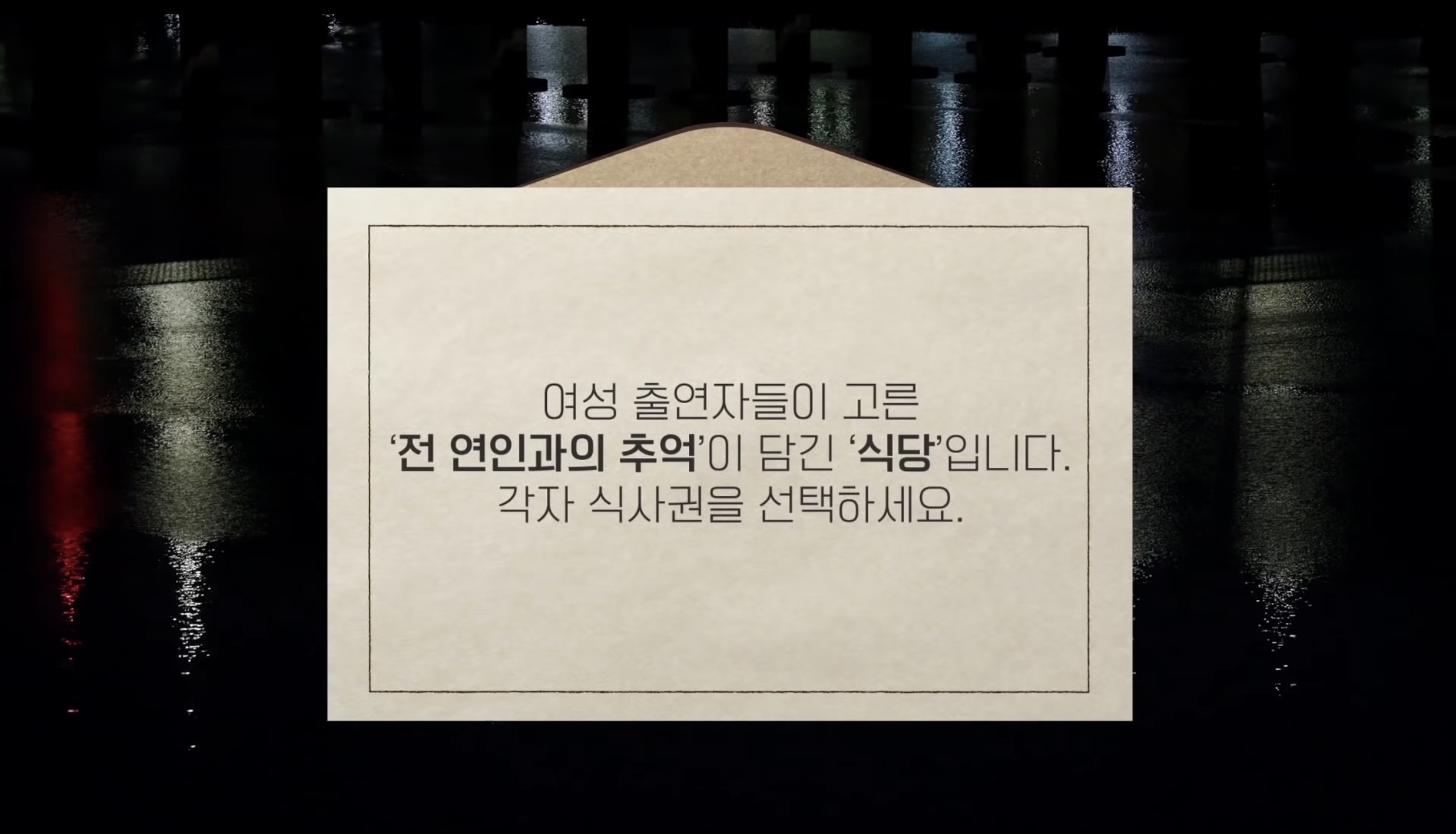 여성 출연진 추억의 장소의 식당 이름을 보고 남성 출연진이 무작위로 고른다음에 데이트를 하는 것입니다.