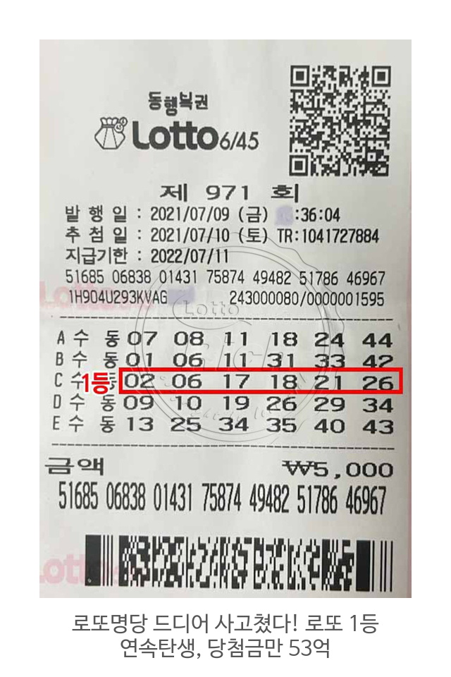 온라인 로또 명당!! 971회 당첨 37억 지급★