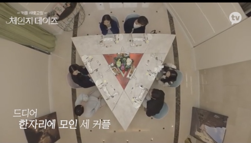 한자리에 모인 세 커플은 서로 화기 애매하고 재미있게 대화를 나누다가 서로 비슷한 상황임을 알고 있기 때문에 질문을 시작하고 있습니다.