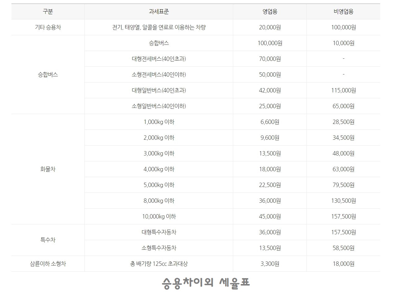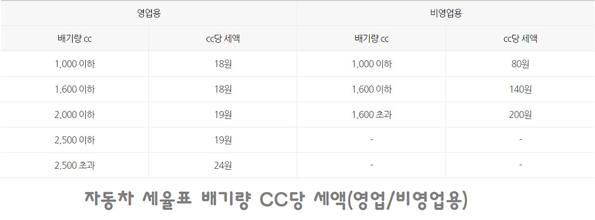 - 1대당 연세액은 배기량에 cc당 세액을 곱하여 산정합니다.