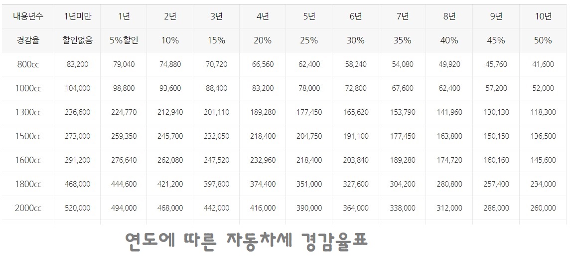 - 비영업 승용차에 대해서는 최초등록후 3년이상 되는 해부터 5%씩 경감하고 상한율이 50%이다.