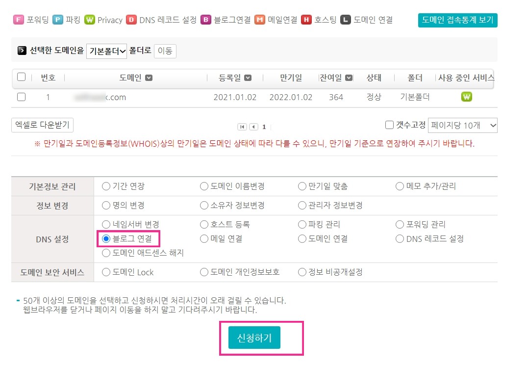 주의) 1. 개인도메인 구매 -블로그 연결 설정후! 2.내 블로그에서 개인도메인 연결을 합니다.