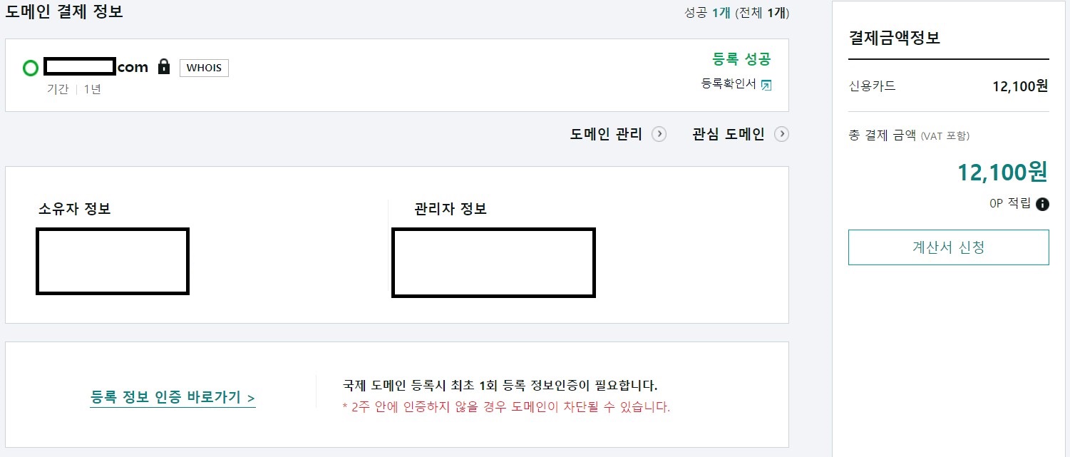 그런데 특이하게 등록정보 인증을 하라고 하더라고요. 저는 com으로 구매했기 때문에 인증을 했습니당. 절차는 너무나 간단해요~ 그냥 보시고 따라하시면 됩니다.